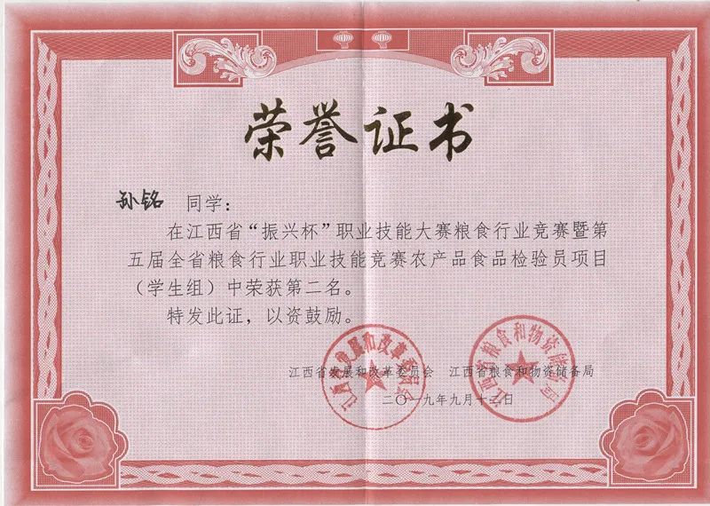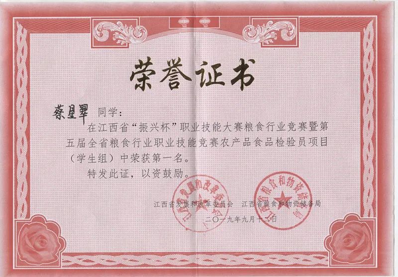 2.学生荣获江西省“振兴杯”职业技能大赛粮食行业竞赛暨第五届全省粮食行业职业技能竞赛农产品食品检验员项目一、二、三等奖。