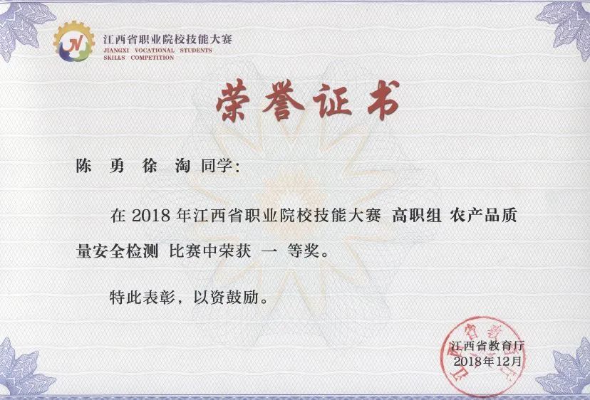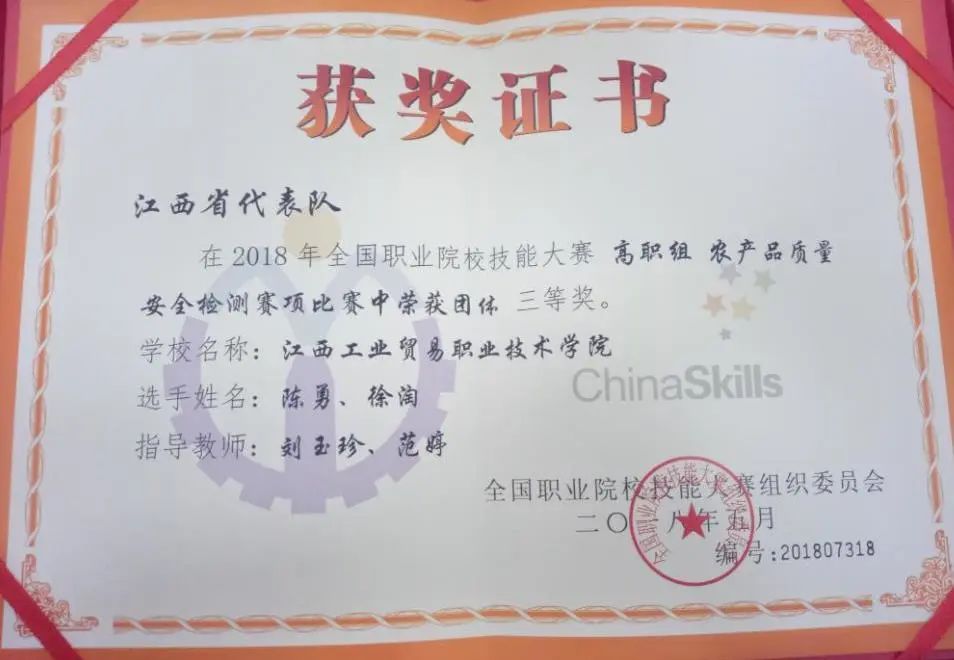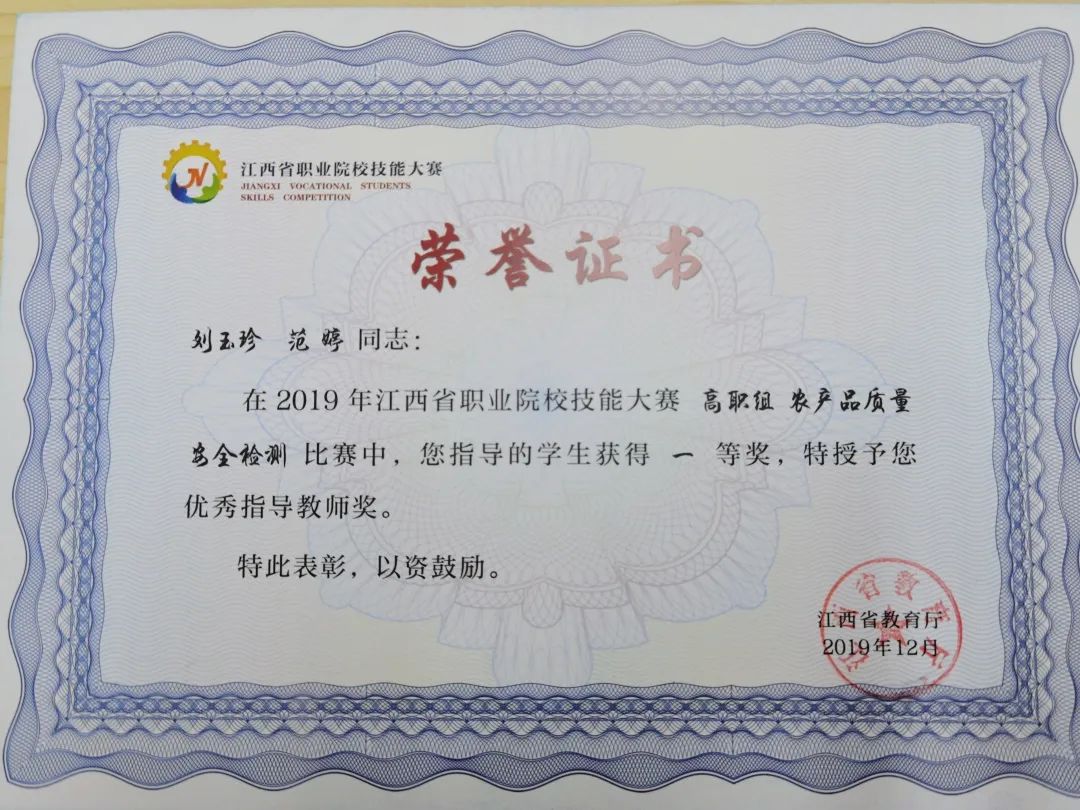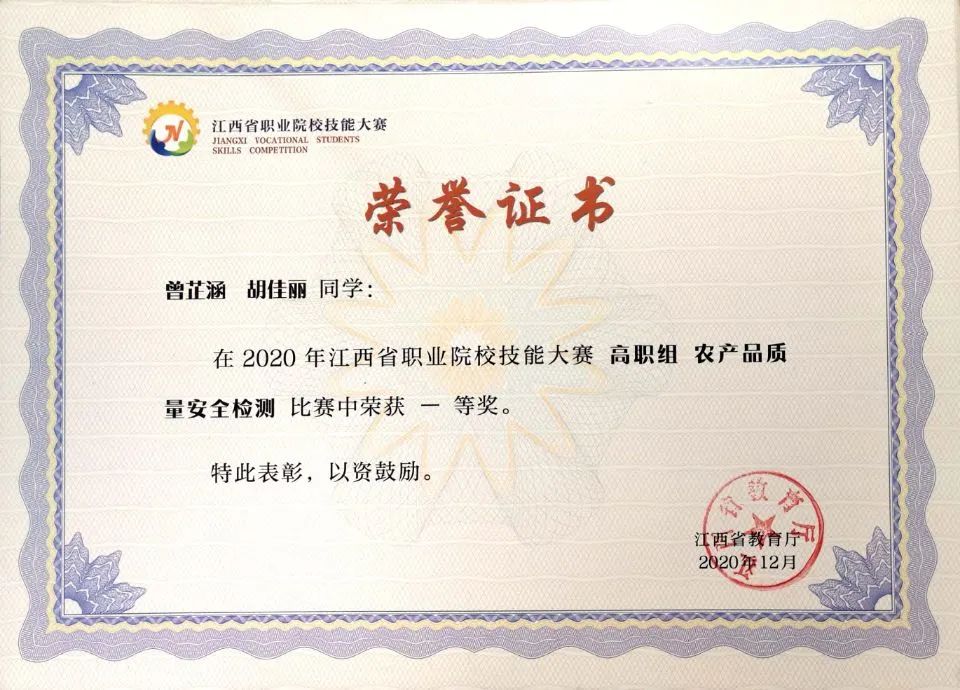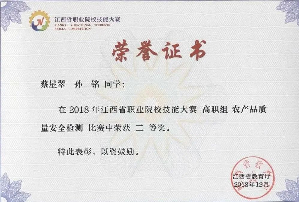 1.学生荣获2018年全国职业技能大赛农产品质量安全检测赛项三等奖,连续三年(2018-2020年)蝉联该项目江西省职业技能大赛一、二等奖。