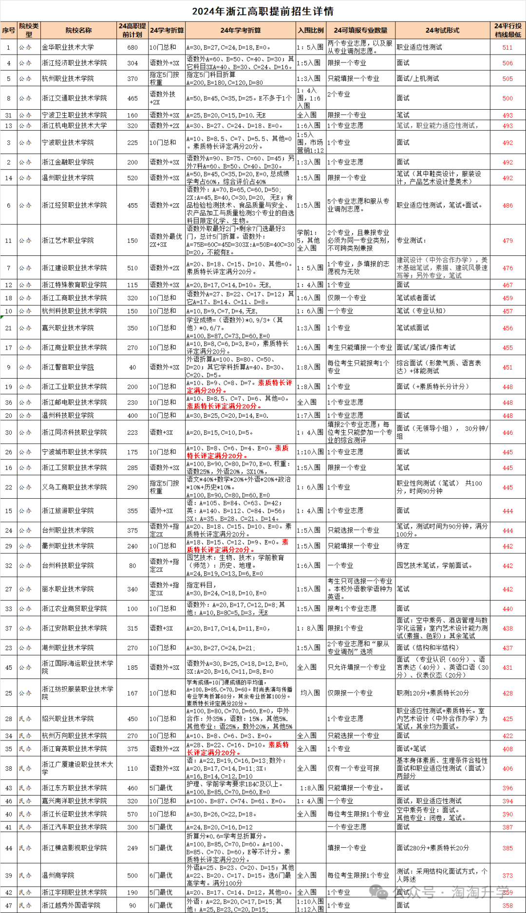 2024年,浙江省高职提前招生的招生院校共有47所,各校报名条件(学考折算方式)如下图,供2025届考生参考!