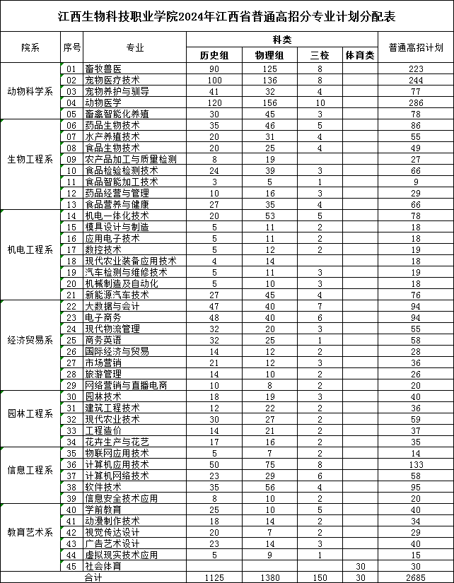江西生物科技职业学院2024年江西省普通高招分专业计划分配表