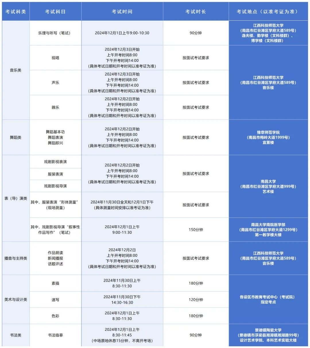江西省2025年艺术类专业统考各科类(科目)考试时间、考点安排