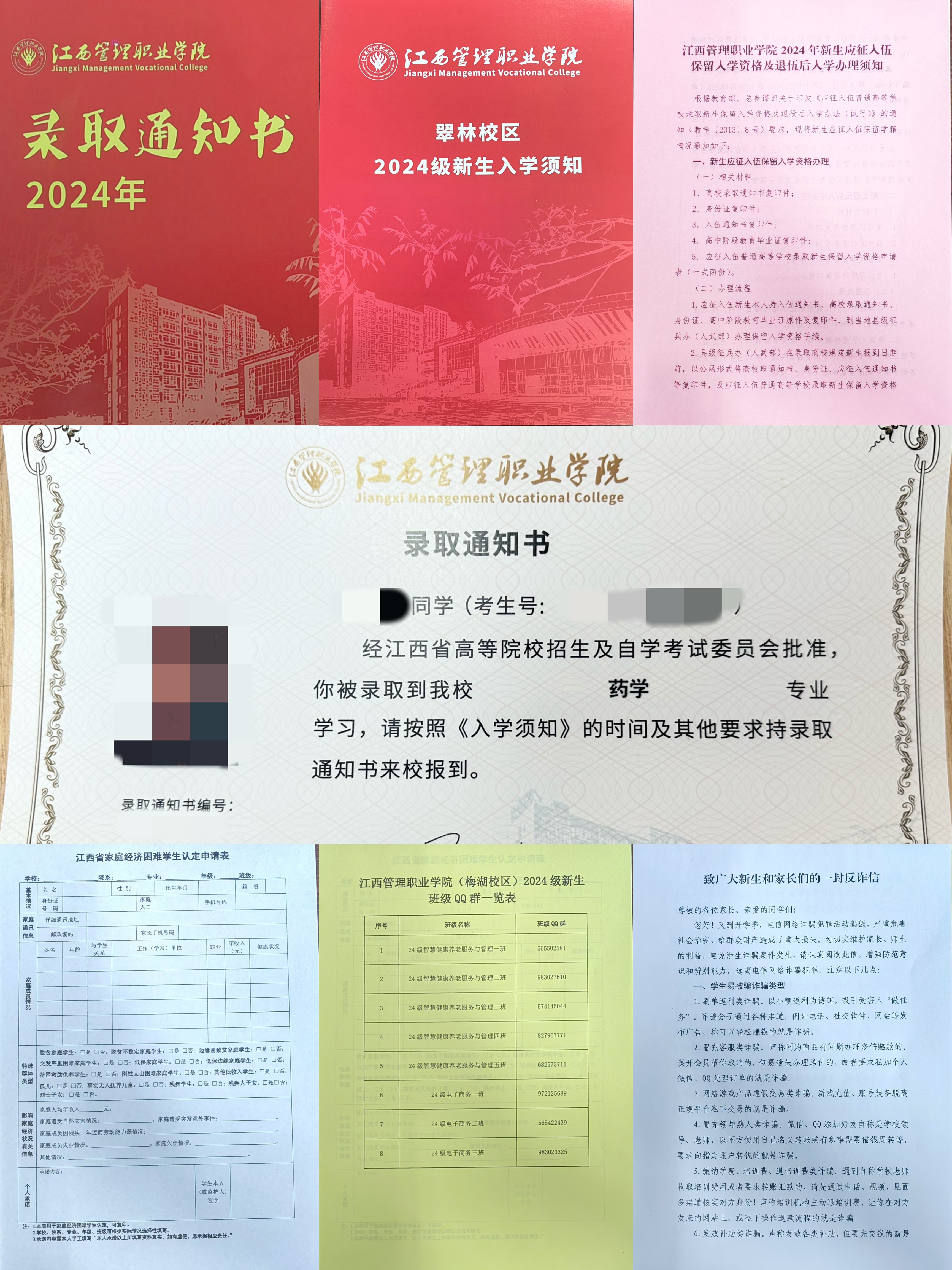 考生收到的包裹内将包含录取通知书、新生入伍保留资格及退伍入学办理须知、2024级新生入学须知、致广大新生和家长们的一封反诈信、2024级新生班级QQ群一览表、江西省家庭困难学生认定申请表等资料。