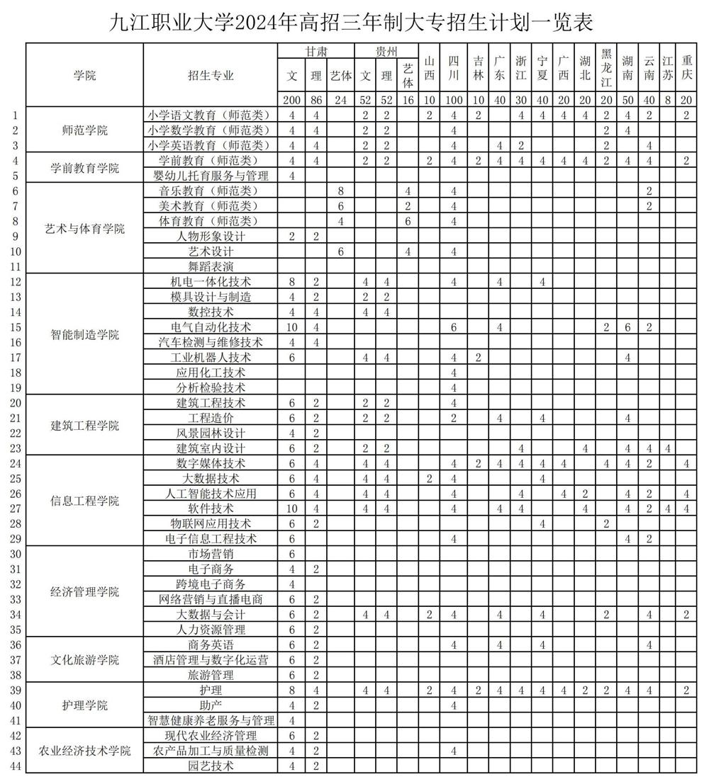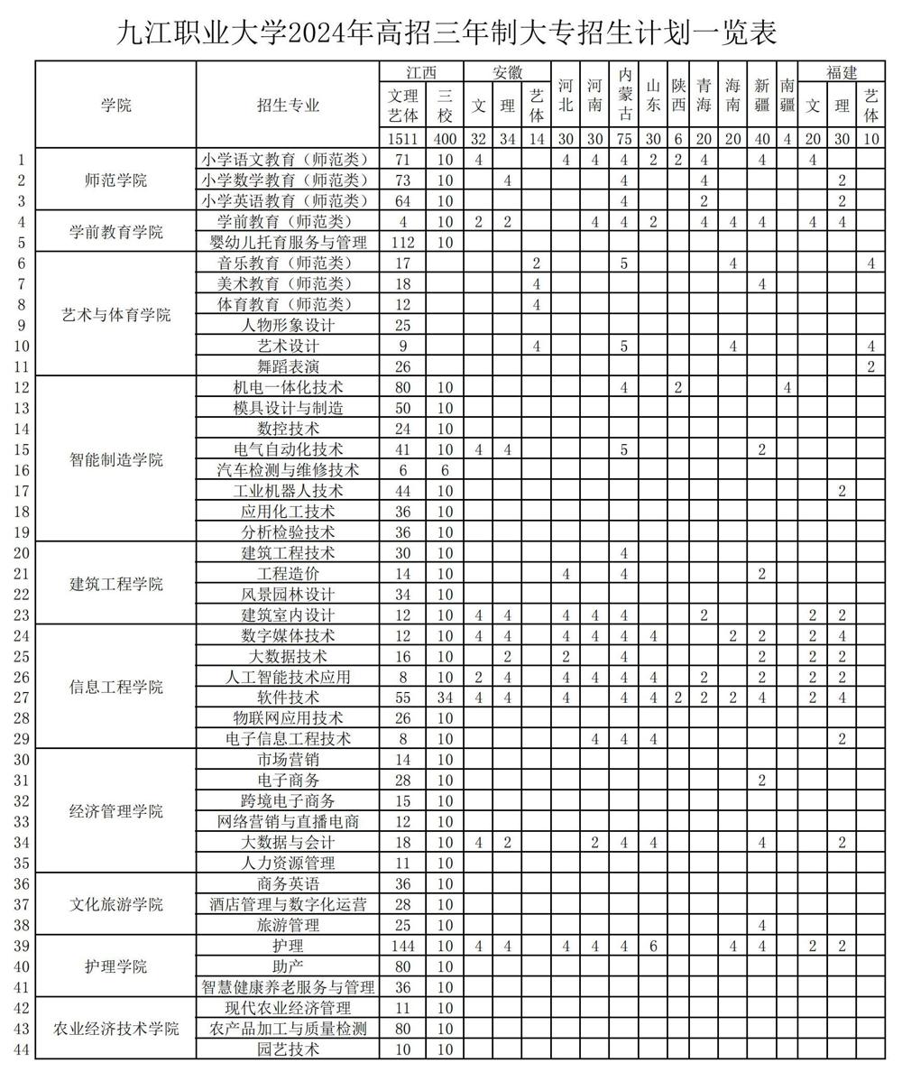 九江职业大学2024年高招三年制大专招生计划一览表