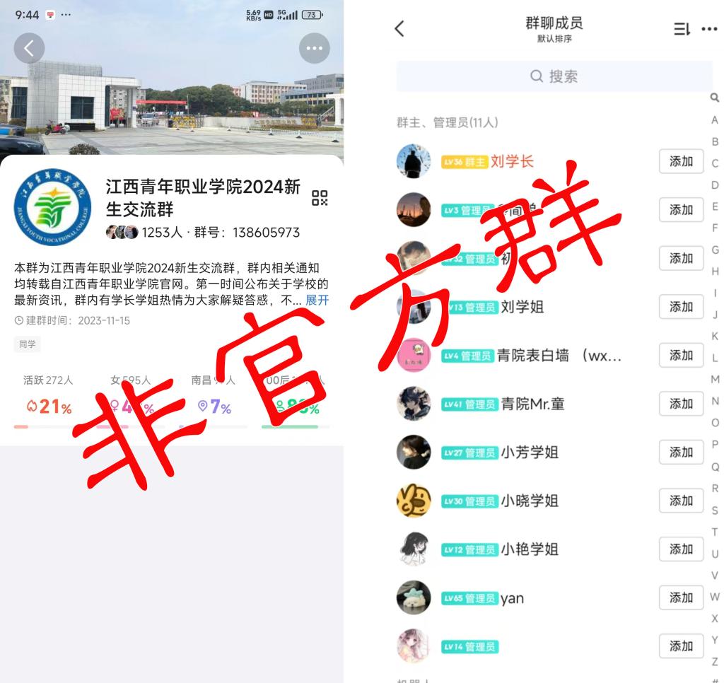 近日,有部分非学校官方人员假借“江西青年职业学院”工作人员或者学长身份,通过微信、QQ、小红书等方式建立新生群,在群内散布各种推销、虚假信息。在此,我校向社会和广大新生严正声明: