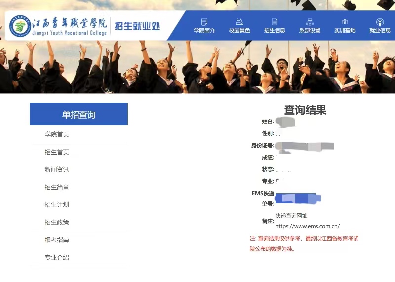 录取页面会显示:姓名、身份证号、状态、专业、EMS快递单号等信息。考生认真核对你的信息并记录下来。