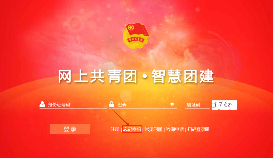 【注】:若显示身份证或密码错误,请联系毕业院校确认本人是否已被录入“智慧团建”系统,若确认在系统内,可让本级或直属上级团支部管理员生成“密码重置码”,拿到密码重置码后打开系统首页选择“忘记密码”,按照页面提示操作即可。(详见常见问题及解答2)
