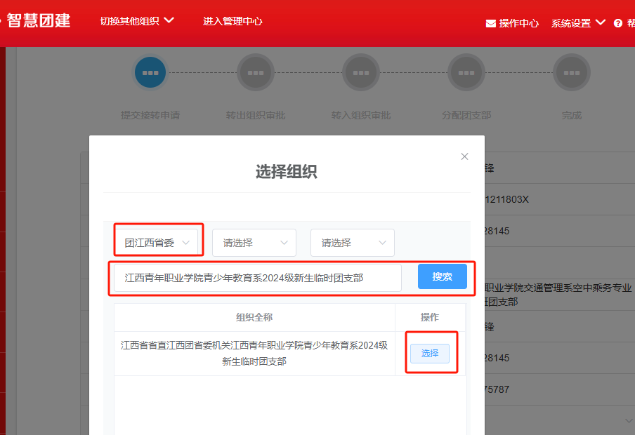 3.选择“团江西省委”,根据本人录取专业所在系部在搜索栏输入“江西省省直江西团省委机关江西青年职业学院XXX系2024级新生临时团支部。(根据录取专业选择相应系部,我校共有三个系部:青少年教育系、交通管理系、经济管理系)【注】:请勿直接选择江西青年职业学院团委进行转入。