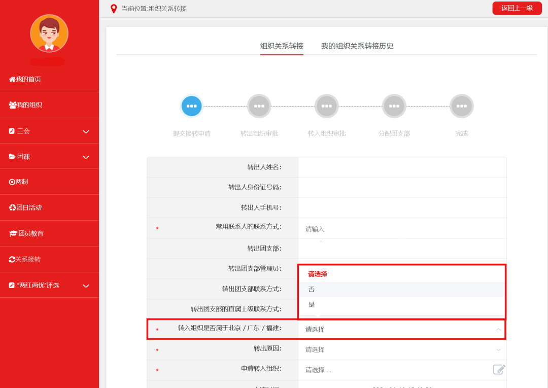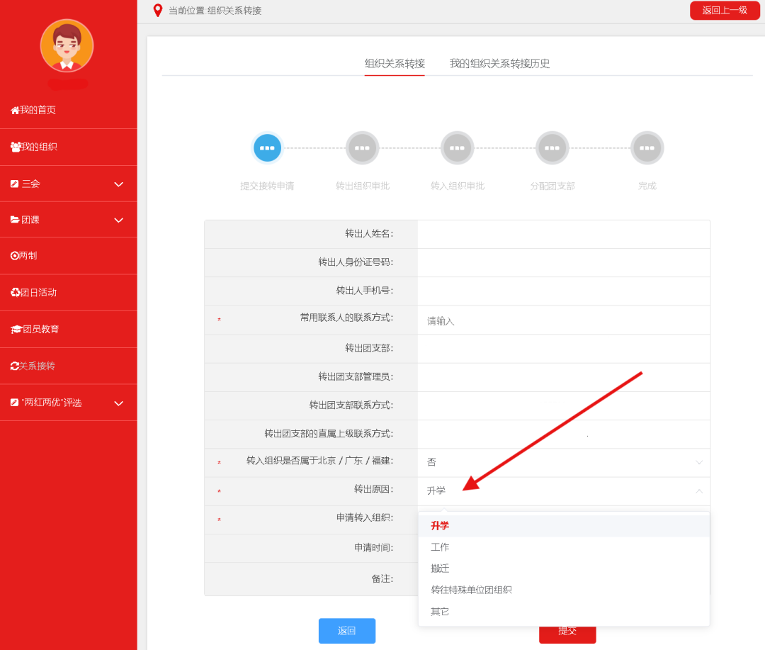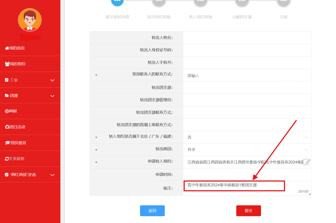 1.团员个人发起申请必须填写联系方式、转接原因、转入组织名称等相关信息(转入组织名称根据个人专业所在系部选择,发起转入之前切记备注好个人的系部和专业,否则将被打回),检查无误后点击提交,等待审批即可。