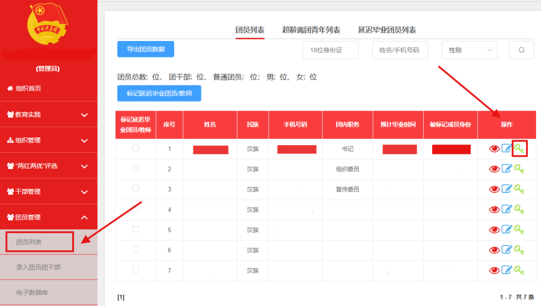 ③组织管理员需登录智慧团建,然后在团员管理--团员列表--操作区,点击忘记密码团员的小钥匙图标获得重置密码验证码。
