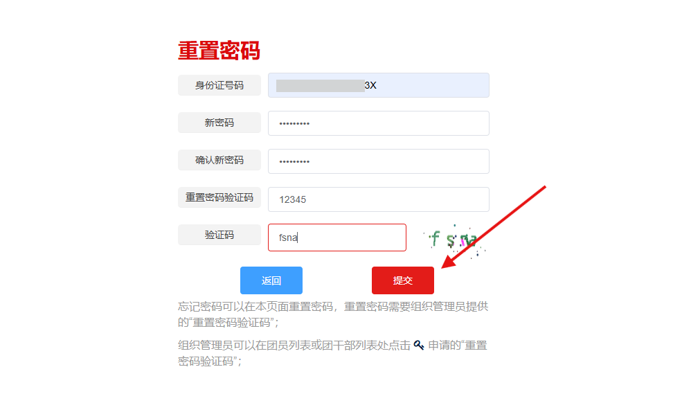 ④从管理员处拿到重置密码验证码后,正确填写身份证号码、新密码、重置密码验证码后,点击提交即可。