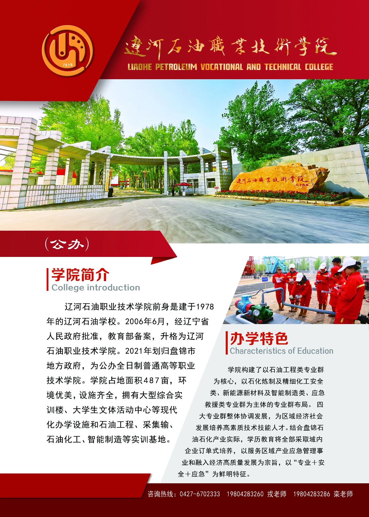 辽河石油职业技术学院前身是建于1978年的辽河石油学校。2006年6月,经辽宁省人民政府批准,教育部备案,升格为辽河办学特色石油职业技术学院。2021年划归盘锦市地方政府,为公办全日制普通高等职业学院。学院占地面积487亩,环境优美,设施齐全,拥有大型实训楼、大学生文体活动中心等现代化办学设施和石油工程、采集输、石油化工、智能制造等实训基地。