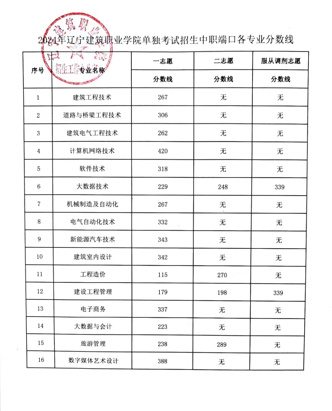 辽宁建筑职业学院2024年单独考试招生中职端口报名各专业录取分数线