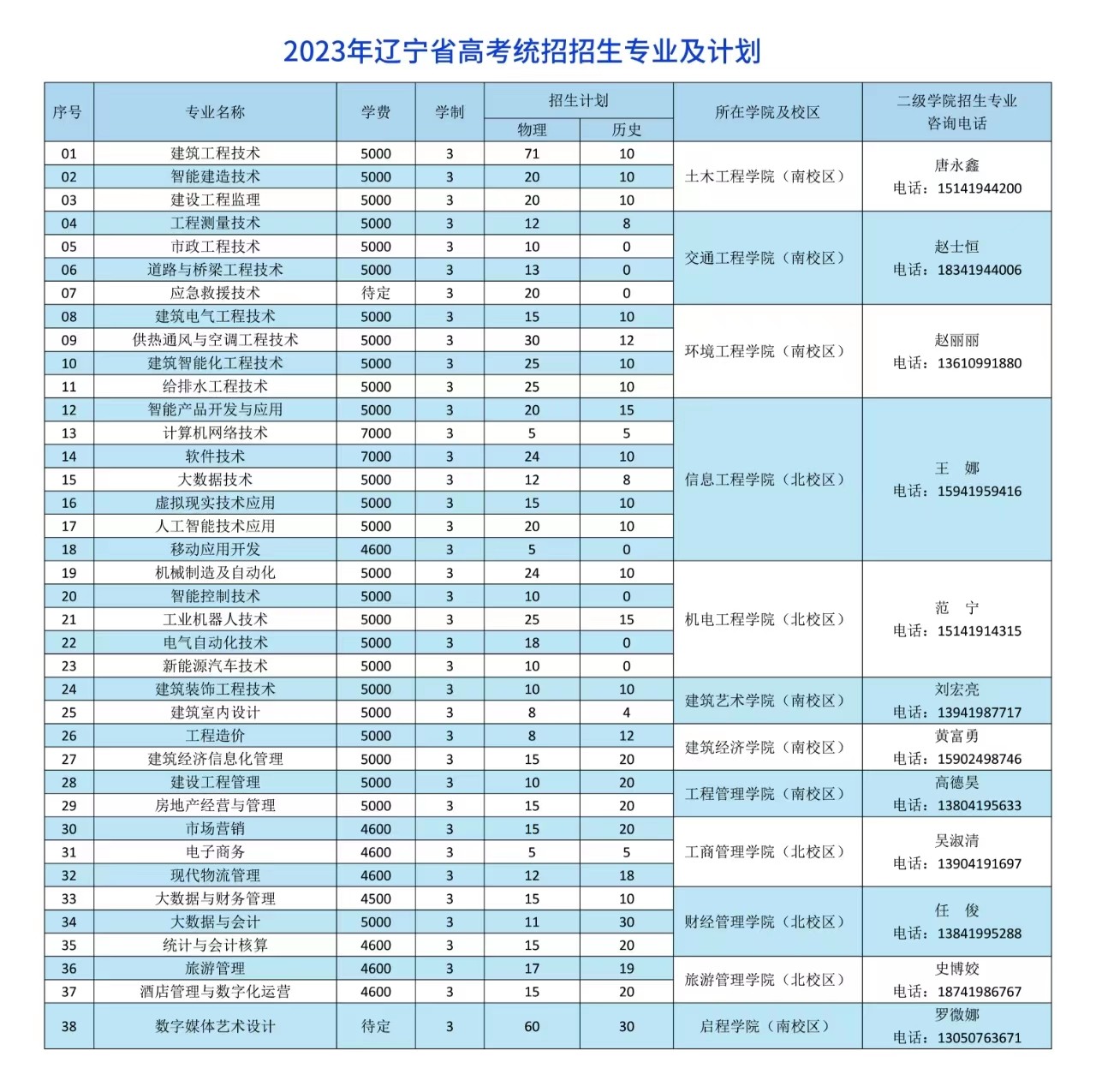 辽宁建筑职业学院2023年省内统招招生计划、专业所在学院、校区、专业咨询电话