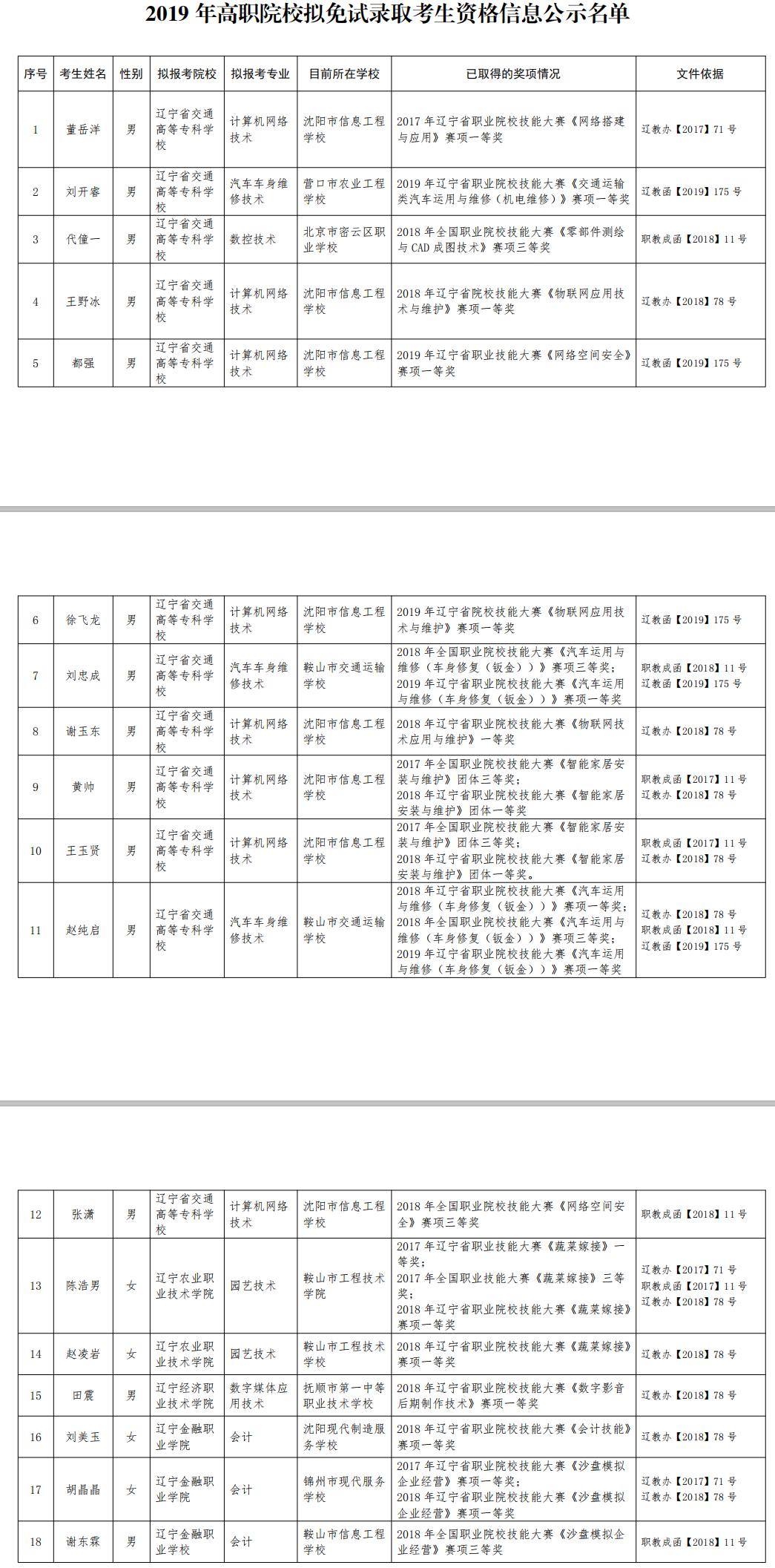 根据《辽宁省教育厅关于 2019 年高等职业院校单独考试招生工作的通知》(辽教发〔2019〕11号)和《辽宁省教育厅关于高等职业院校开展免试录取工作的通知》(辽教发〔2016〕21号)要求,经学生本人申请、相关高等职业院校对考生申请材料进行初审、我厅对考生报名资格情况进行复核,现拟对董岳洋等18名中等职业学校应届毕业生申请免试录取到我省有关高等职业院校资格信息予以公示。(具体名单见附件)