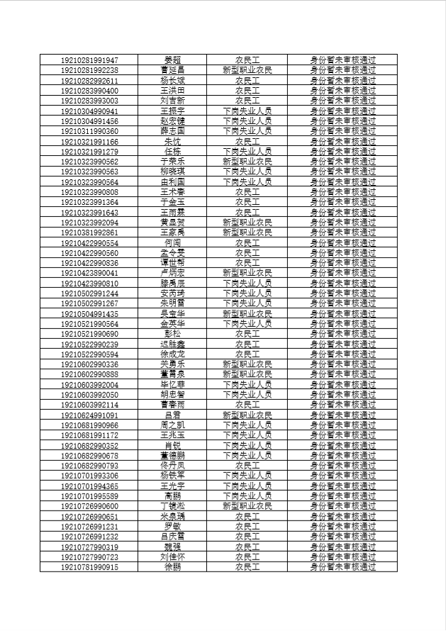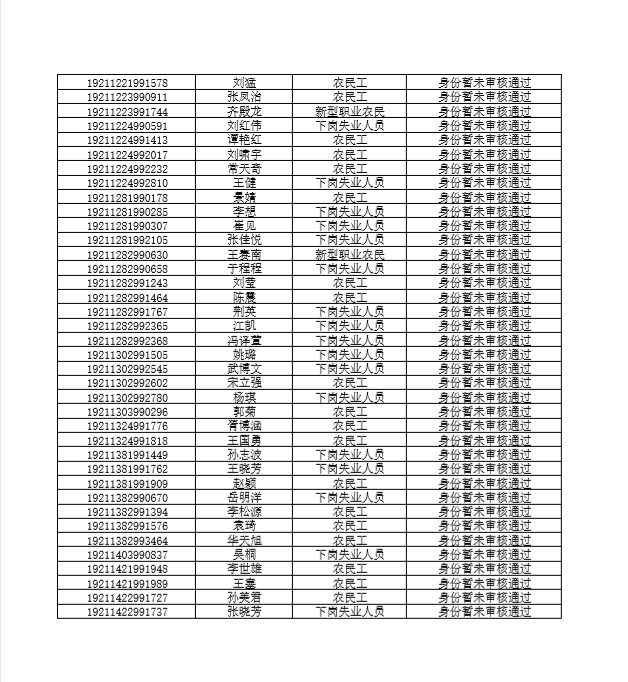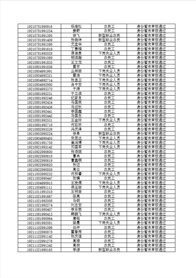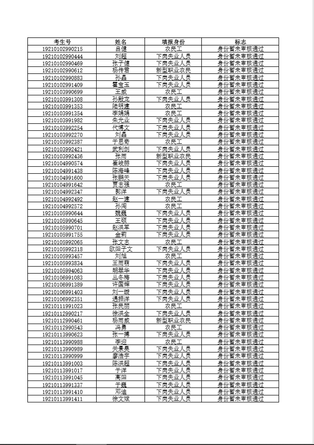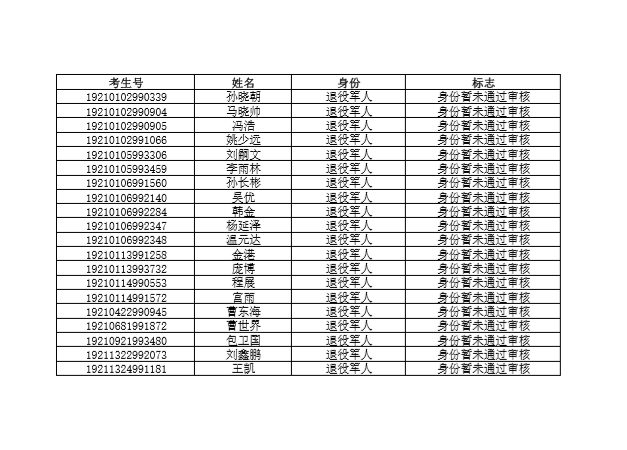 根据辽宁省招生考试之窗发布的公示名单以及相关文件要求,现将考生身份暂时未审核通过名单进行公布,以下考生需在规定时间内(2019年11月28日前)联系相关部门进行身份认定,同时向我校提交所需材料备 查并签订考试承诺书,若考生未按相关要求予以配合,那么将影响考生后续的录取进程,产生的后果由考生本人承担,特此说明!