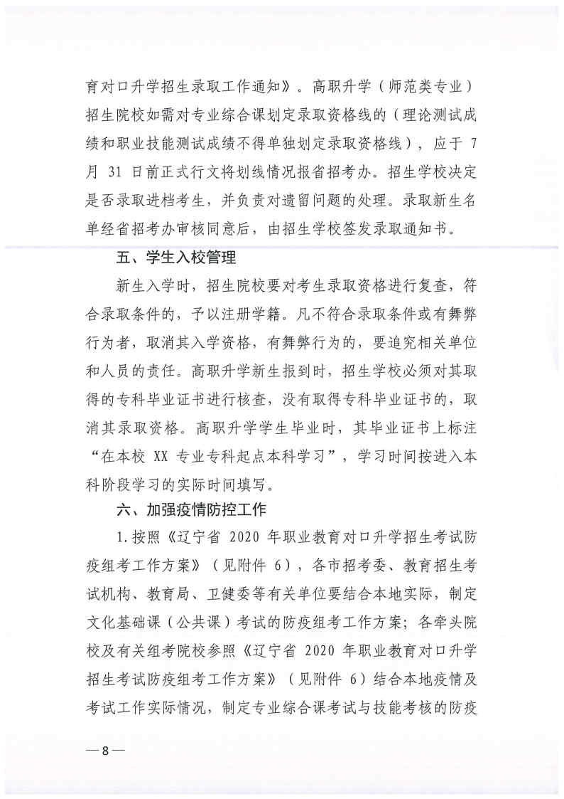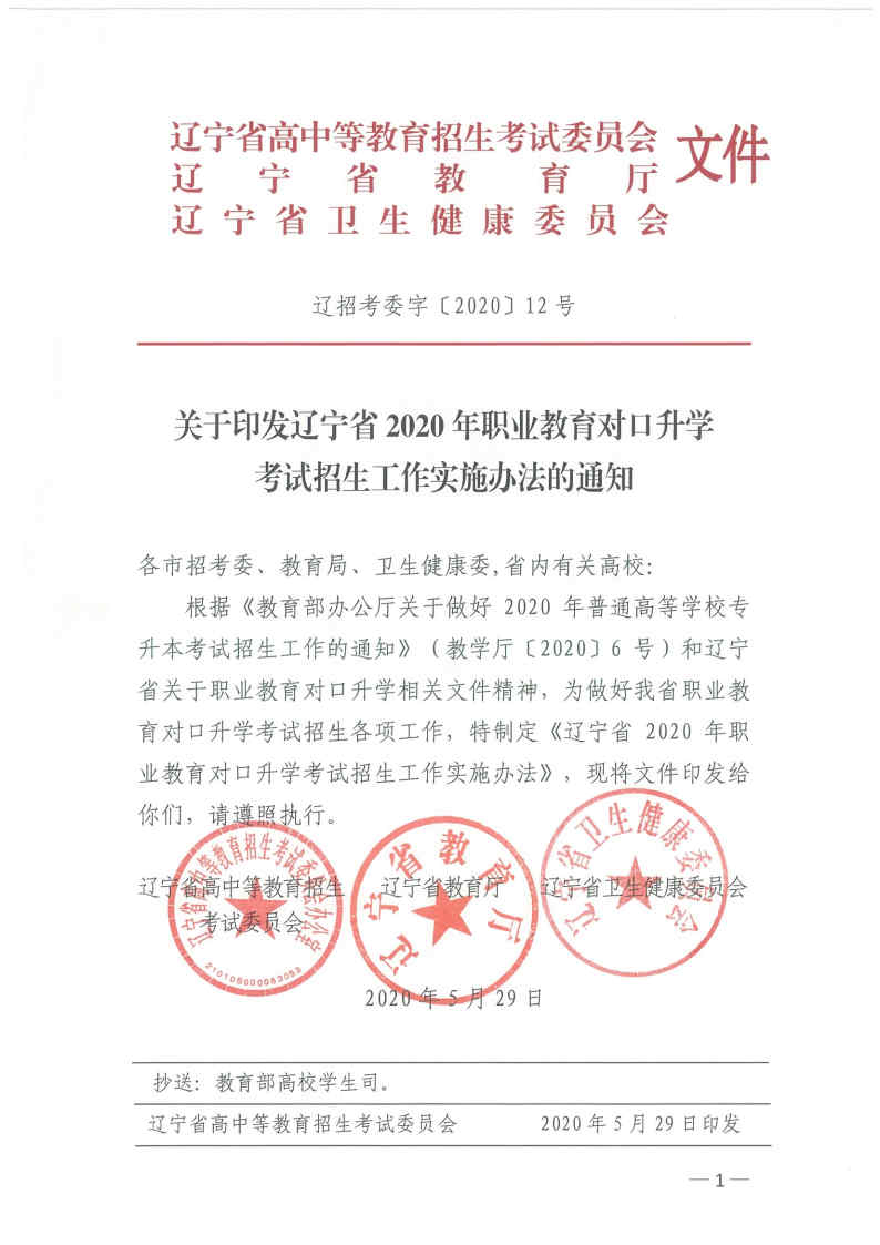 辽招考委字〔2020〕12号--关于印发辽宁省2020年职业教育对口升学考试招生工作实施办法的通知
