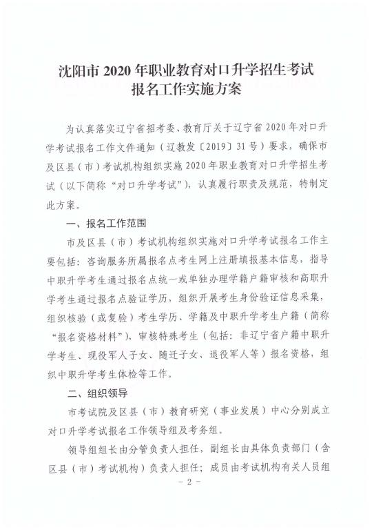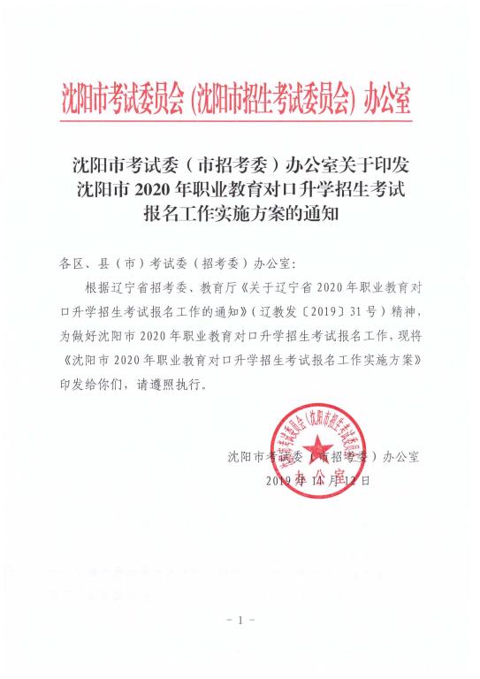 关于印发沈阳市2020年职业教育对口升学招生考试报名工作实施方案的通知