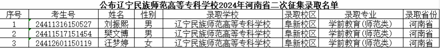 公布辽宁民族师范高等专科学校2024年河南省二次征集录取名单