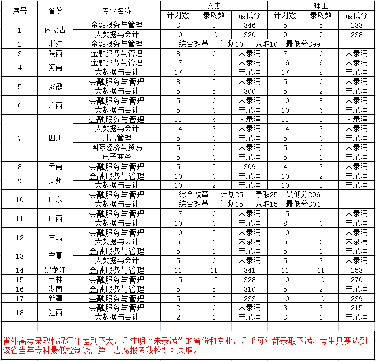 辽宁金融职业学院2021年高考省外各专业录取情况