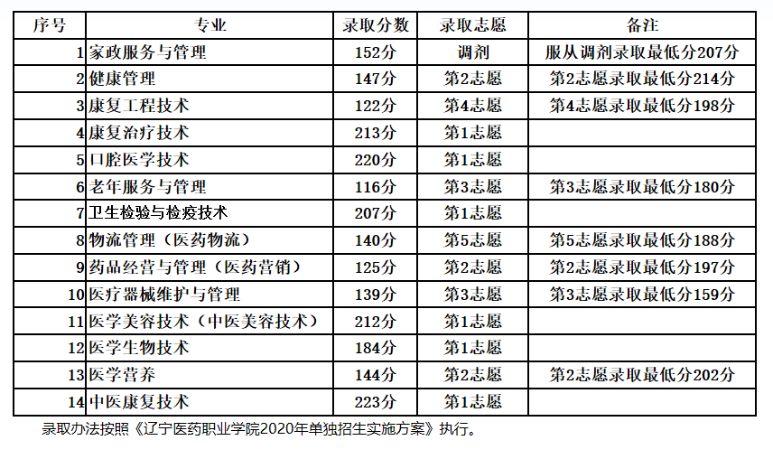 辽宁医药职业学院2020年单独招生(招收高中毕业生)最低录取分数线