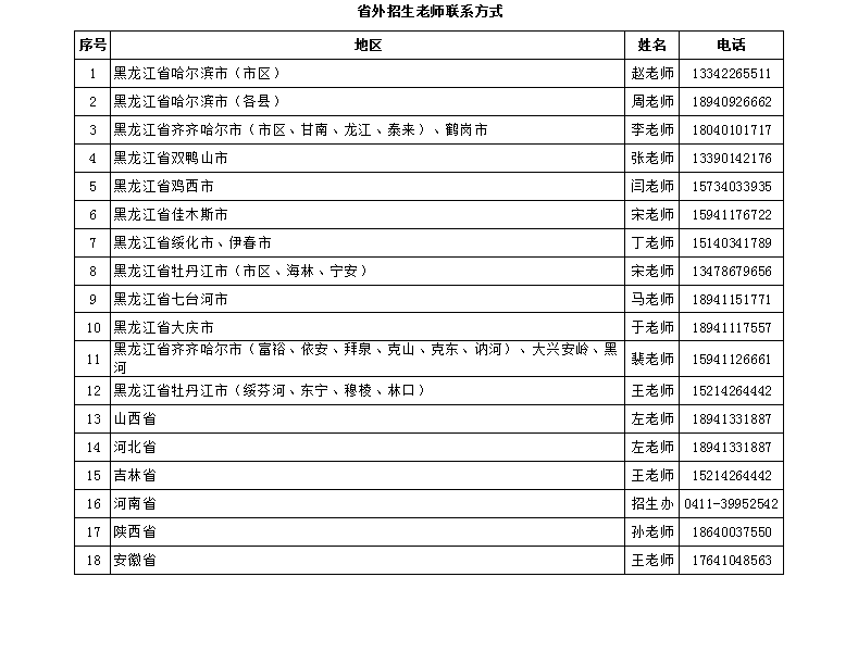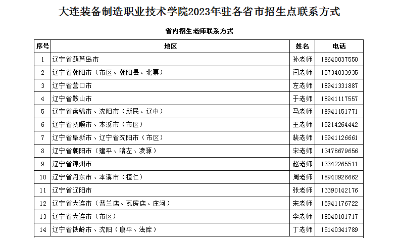 大连装备制造职业技术学院2023年驻各省市招生点联系方式