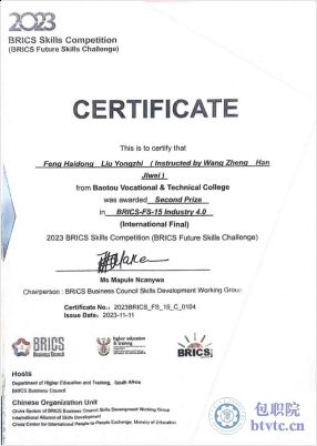 1 | 冯海东 刘勇志 | 2023.11 | 金砖国家职业技能大赛“工业4.0”赛项 | 二等奖 |