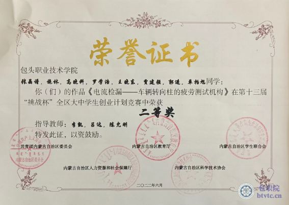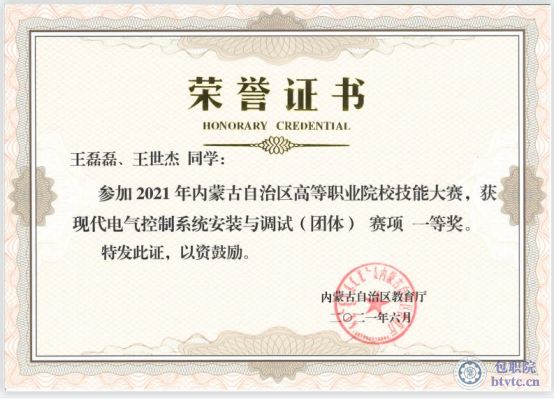 2 | 王世杰 王磊磊 | 2021.5 | 自治区高等职业院校暨全国职业院校技能大赛选拔赛“现代电气控制系统安装与调试”赛项 | 一等奖 |
