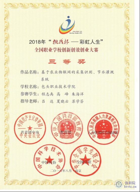 1 | 程志禹等 | 2018 | 《基于农业物联网的采集识别、节水灌溉系统》 | 全国三等奖 |