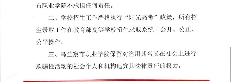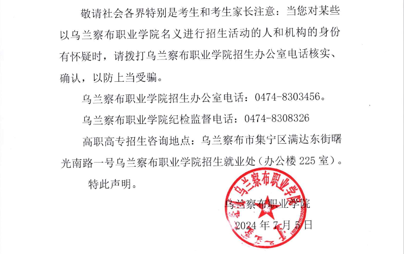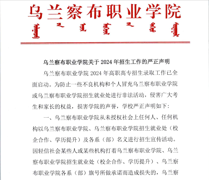 乌兰察布职业学院关于2024年招生工作的严正声明