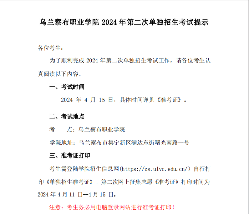 乌兰察布职业学院 2024 年第二次单独招生考试提示