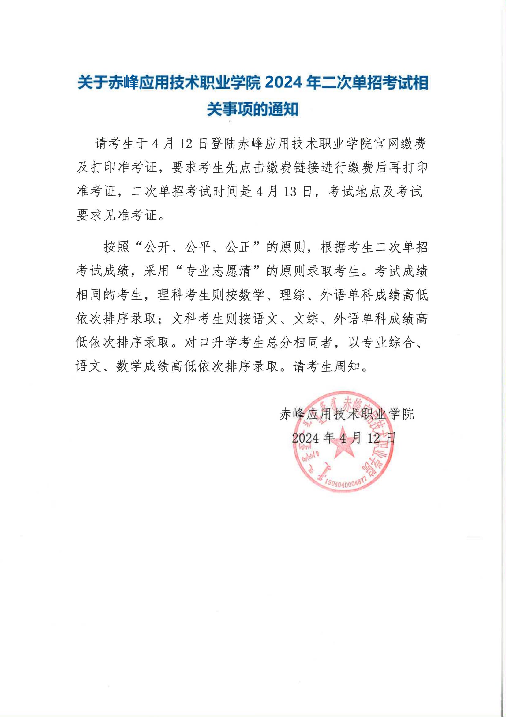 关于赤峰应用技术职业学院2024年二次单招考试相关事项的通知