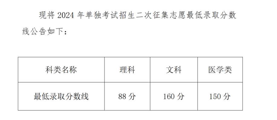 乌兰察布医学高等专科学校2024年单独考试招生二次征集志愿最低录取分数线公告
