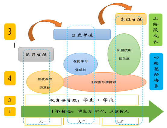 “3”即三阶段成长。学生大学三年中经历“见习学徒、学徒、高级学徒”三个阶段,大一学年为见习学徒(10个月),每周安排1天在酒店跟岗见习或参加企业培训;大一结束至大三上半学年(18个月)为正式学徒,工学交替学习专业课程,逐步成长为企业正式员工;大三下半学年(6个月)为高级学徒,在岗综合训练服务与管理能力,实现向“酒店职业人”的蜕变,为终身职业生涯发展奠定坚实基础。