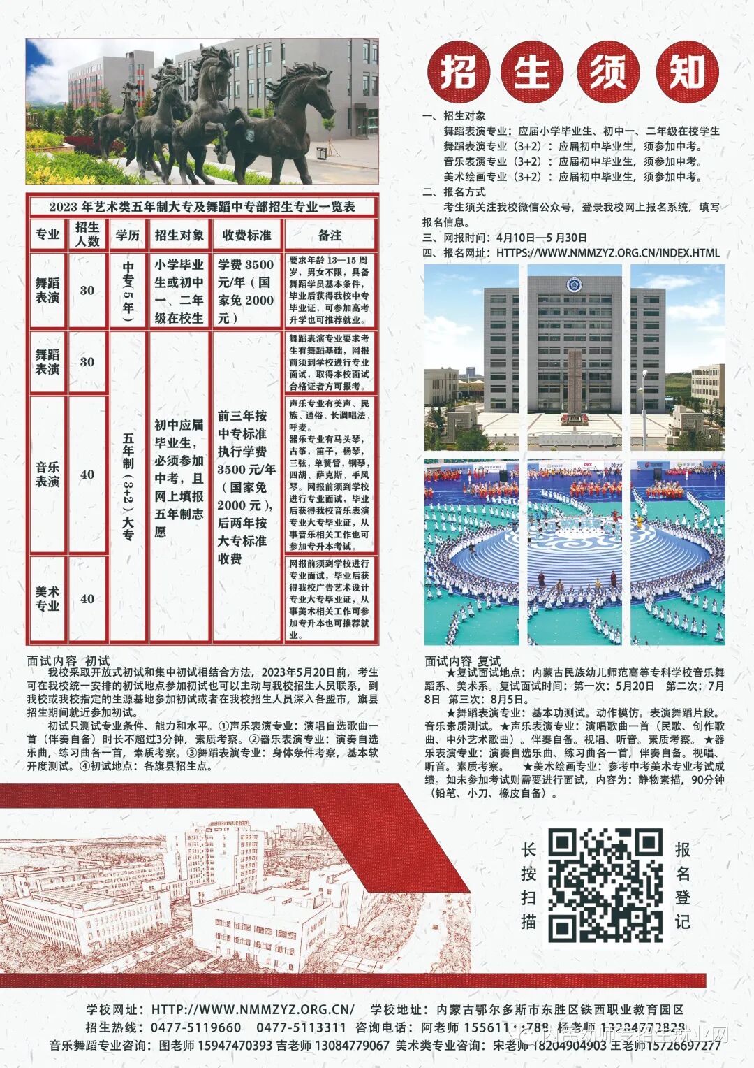 温馨提示:报考美术类考生如果参加鄂尔多斯市2023年中考美术特长生专业课统一考试的只需提供合格成绩单即可,不用参加学校面试。记得扫码登记并在中考结束后务必在内蒙古招生考试信息网填报3+2志愿。