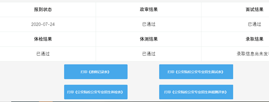 5.登录后,查看个人的信息,分别打印《患病记录表》、《公安院校公安专业招生面试表》、《公安院校公安专业体检表》(正反面打印)、《公安院校公安专业招生体能测评表》(因表内有照片最好使用彩色打印,如无法彩色打印,请贴好照片)