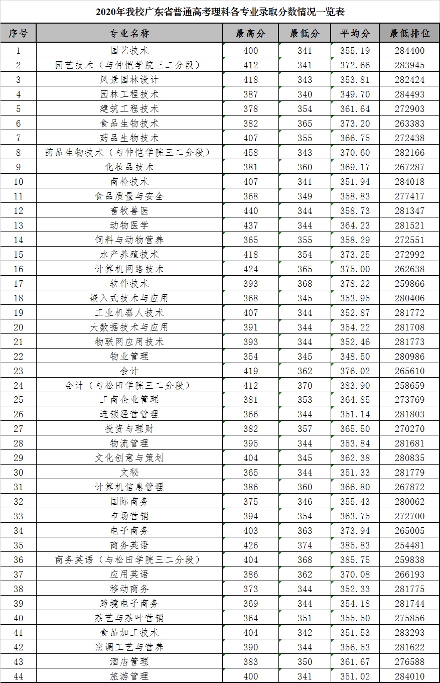 2020年我校广东省普通高考理科各专业录取分数情况一览表