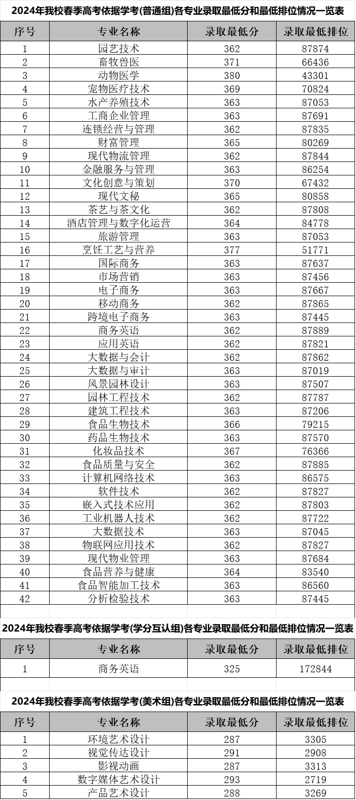 2024年我校春季高考依据学考各组各专业录取最低分和排位情况一览表
