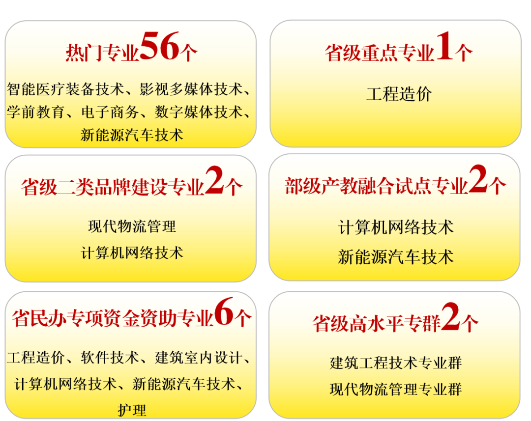 招生专业56个,覆盖信息工程类、智能制造类、教育类、经济管理类、建筑工程类、医药卫生类等12个专业大类。学费19800-22900元/生/学年,住宿费1700-2000元/生/学年。