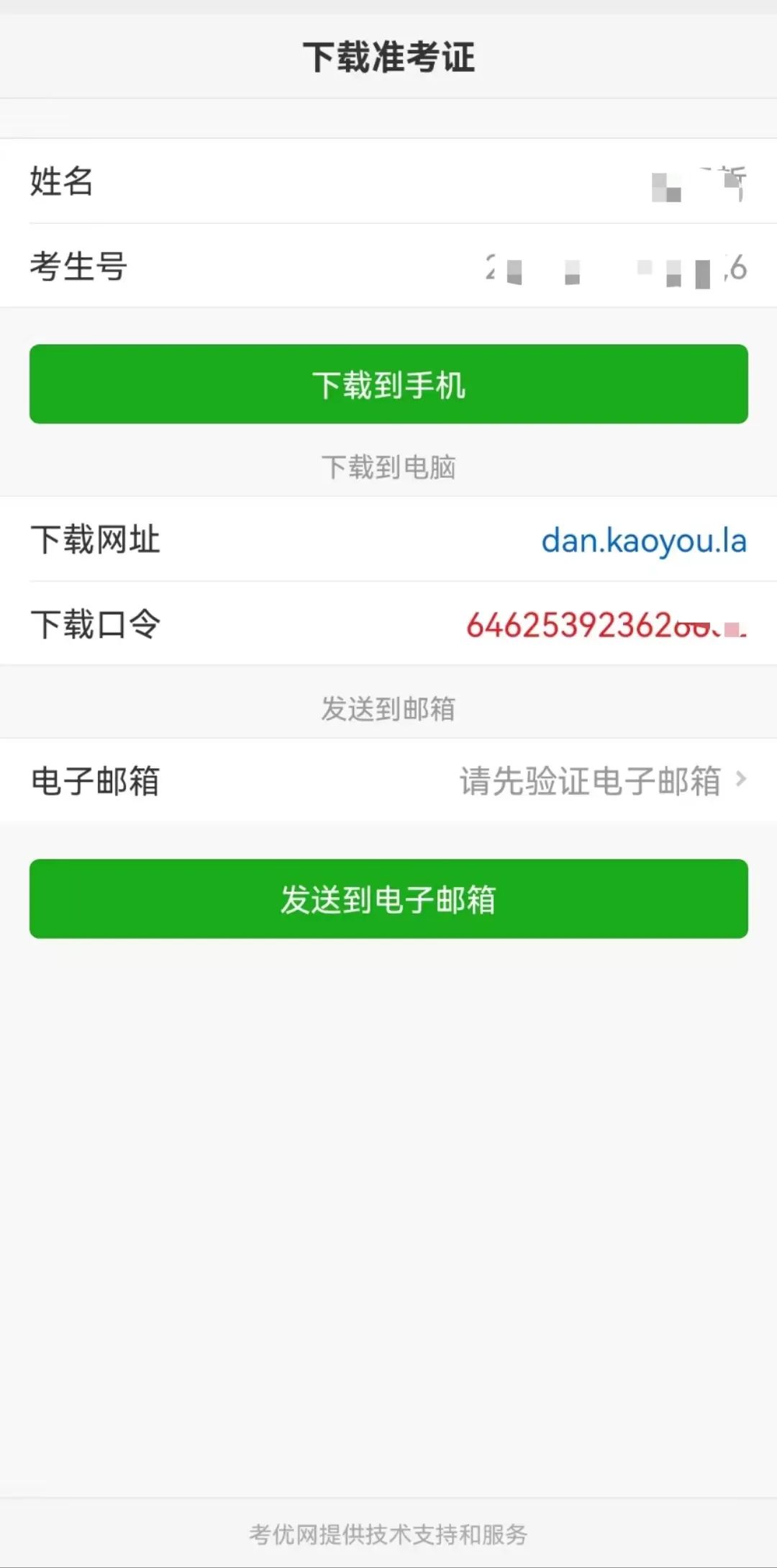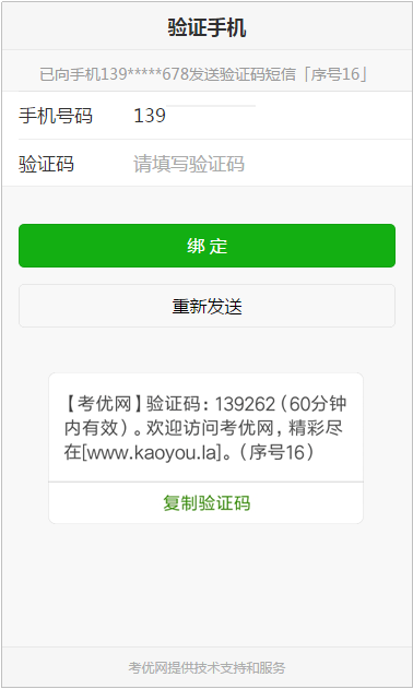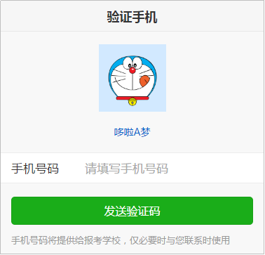 系统向考生手机发送随机验证码短信,考生填写验证码,完成验证。