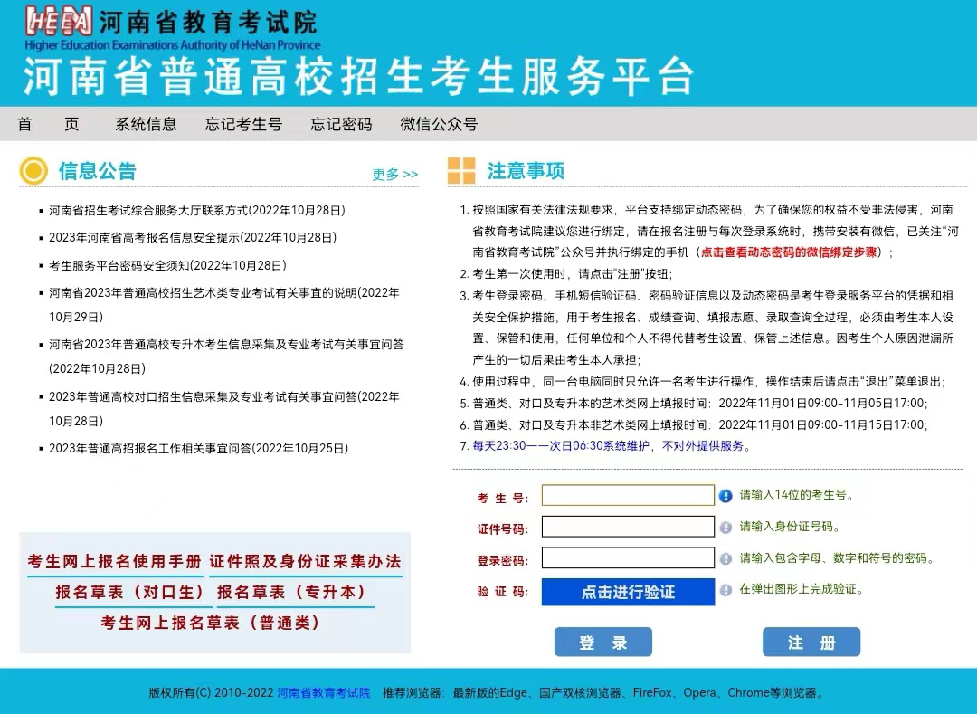 进入考生服务平台后,请仔细阅读“信息公告”区、“注意事项”区发布的政策公告和注意事项。