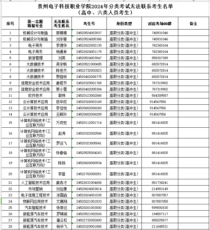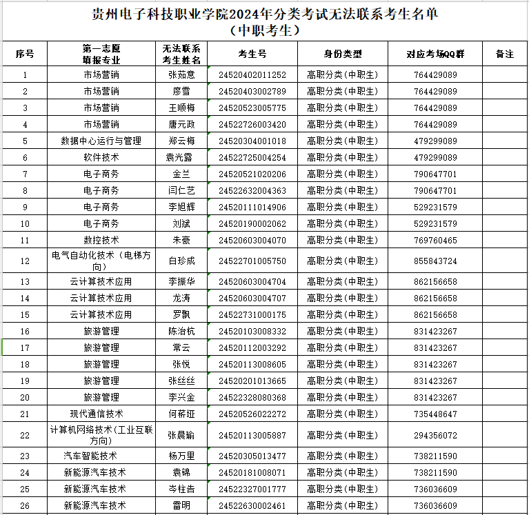 根据贵州省招生考试院下发的2024年高职分类招生考试的考生信息,我院通过群发短信、网站公示、电话联系等方式通知符合资格考生参加我院职业技能测试事宜,但其中有部分考生因电话手机停机、关机、无人接听等原因,经我院教师反复联络后依然无法与本人取得联系,具体名单附后。