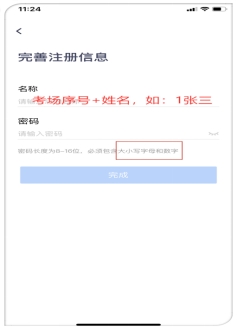 进入“完善注册信息”,设置名称和密码。(注意:名称为考号+真实姓名,如1张三,2李四,如果注册时不知道考号,也可注册之后再修改名称;密码要含有字母的大小写及数字。)