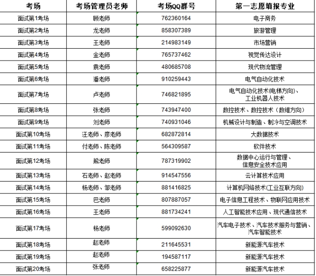 3.加入对应考场QQ群。学校已经提前为大家分配好面试考场,请根据学校发送的短信或电话通知,根据考场号加入下列学校对应的考场QQ群。考生由所在考场QQ群里的联络员老师进行考试指导服务。