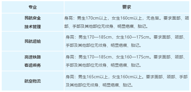 报考我院的考生身体状况均需符合《普通高等学校招生体检工作指导意见》及有关补充规定的要求。结合民航专业特点,患有下列疾病之一的考生慎重报考:生活不能自理、身体残疾、镜片度数大于800度、斜视、色盲色弱、嗅觉迟钝、口吃、双耳听力均在3米以内。