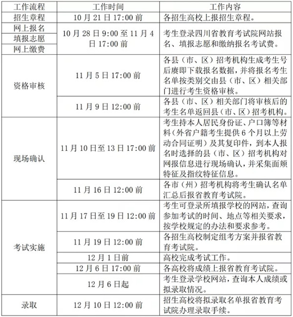 时间:10月28日0:00-11月4日17:00前 地址:四川省教育考试院官网( http://www.sceea.cn) 步骤:填写报名信息-填报志愿-网上缴费