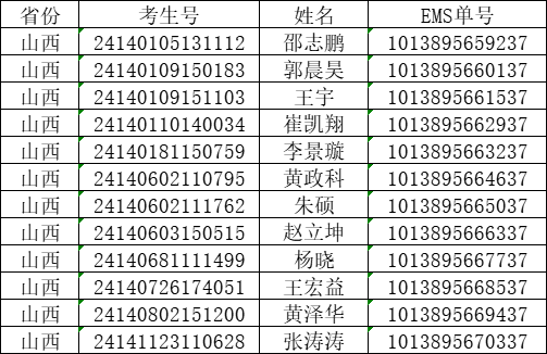 我校2024年在山西录取工作已经结束。现将录取名单和EMS单号公布如下,通知书于8月29日通过邮政EMS寄出。录取新生请于9月5日至6日到学校三星堆校区(四川省德阳市广汉市航天大道155号)报到入学。有任何疑问请拨打学校招生处电话:028-84809675、84809638、84809788。