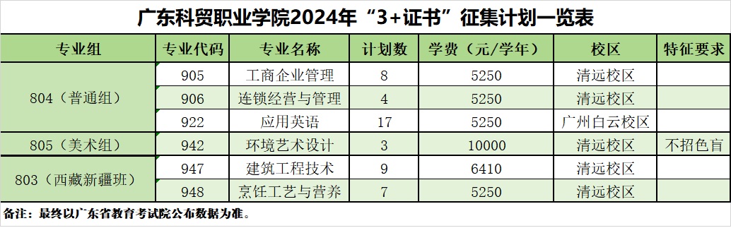 广东科贸职业学院2024年3+证书征集计划一览表