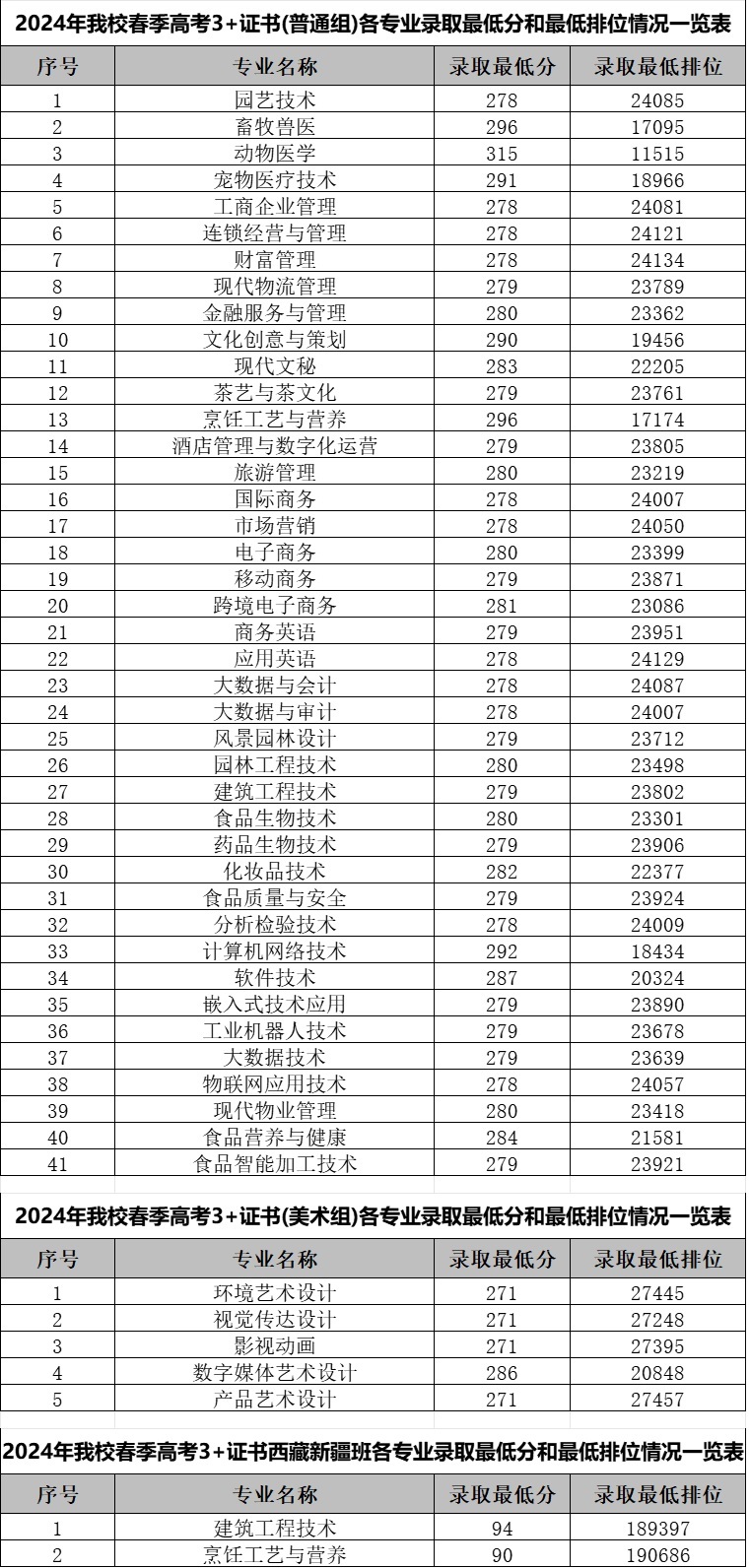 2024年年我校春季高考3+证书各组各专业录取最低分和排位情况一览表