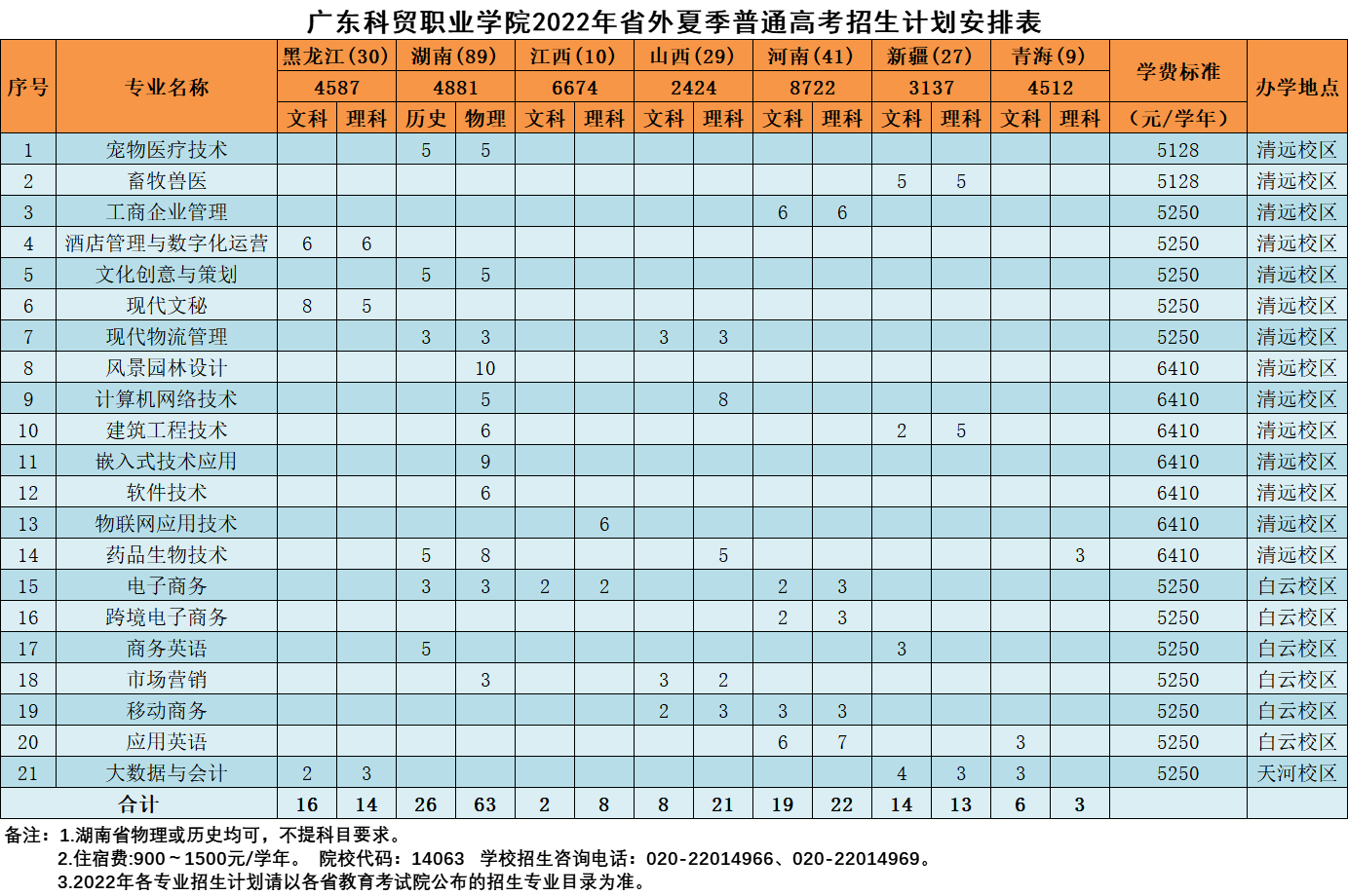 2022年我校省外夏季高考招生计划一览表