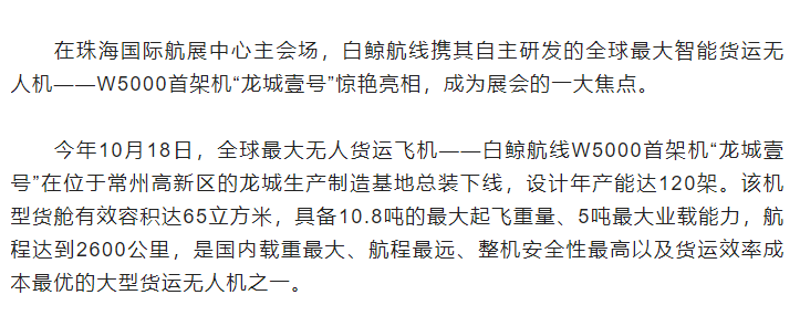 今年第十五届中国国际航空航天博览会在珠海开幕,展示了“高、精、尖”展品及航空航天国防领域创新成果。其中有架全球最大无人机货运飞机成为亮点!